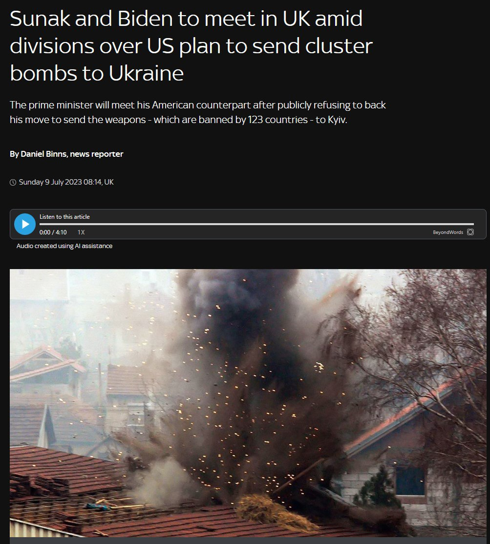 Премьер Риши Сунак заявил, что Великобритания "подписала конвенцию, которая запрещает производство или использование кассетных боеприпасов и препятствует их применению".