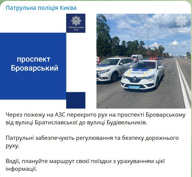 Между тем из-за пожара на АЗС перекрыто движение на Броварском проспекте от улицы Братиславской до улицы Строителей.