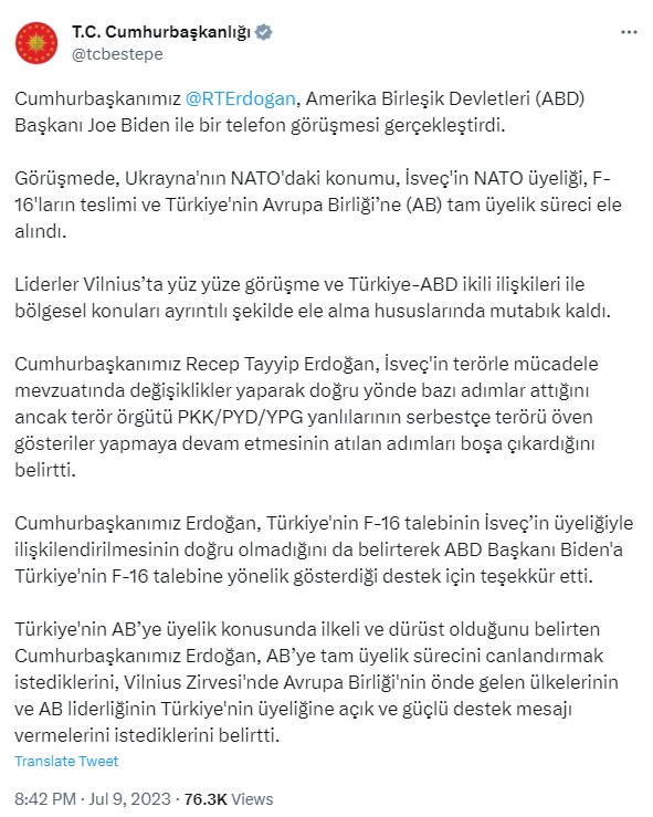 Президент Турции Реджеп Тайип Эрдоган провел телефонный разговор с главой Белого дома Джо Байденом. Стороны обсудили ситуацию с членством Швеции и Украины в НАТО и поставки истребителей F-16.