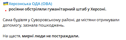 Во вторник, 11 июля, гуманитарный штаб в Херсоне был подвергнут обстрелу со стороны российских военных.