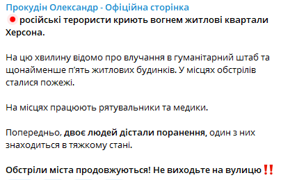 По данным главы Херсонской ОВА Александра Прокудина, помимо попадания в гуманитарный штаб, известно о прилетах по пяти жилым домам.