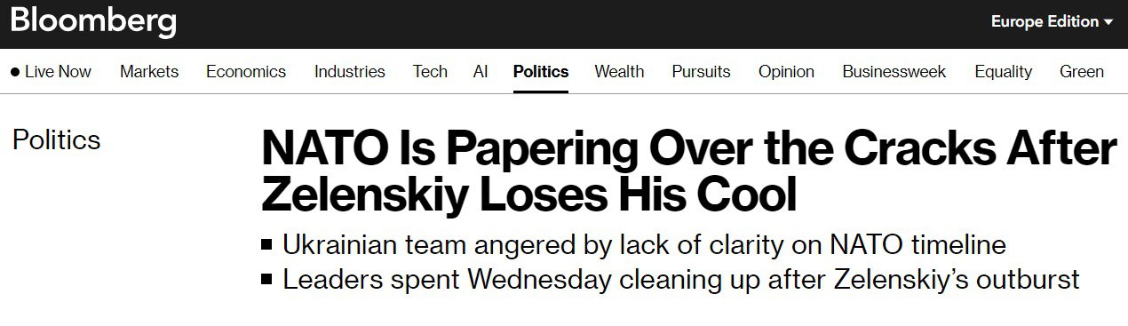 "По словам одного из присутствовавших, за ужином в Вильнюсе, когда президент США Джо Байден вернулся в свой отель, другие лидеры передали Зеленскому четкое послание. Нужно остыть и посмотреть на полный пакет, сказали Зеленскому. В конце концов, ему были даны новые обязательства относительно возможного членства и новые гарантии безопасности со стороны стран Большой семерки", – сказано в публикации под названием "НАТО заделывает трещины после того, как Зеленский потерял хладнокровие".