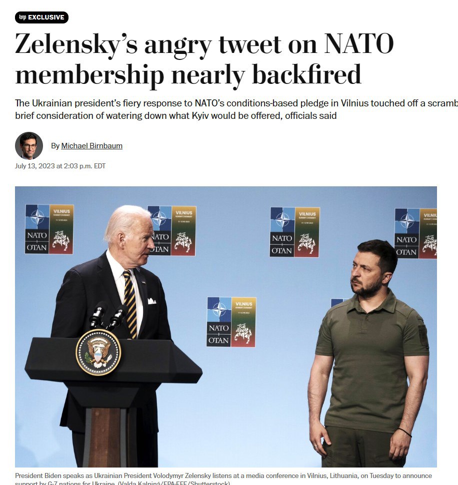 "Этот инцидент иллюстрирует недовольство внутри НАТО тактикой давления Зеленского, когда даже некоторые из его самых ярых сторонников на этой неделе задались вопросом, служит ли он интересам Украины своей вспышкой", - говорится в статье.