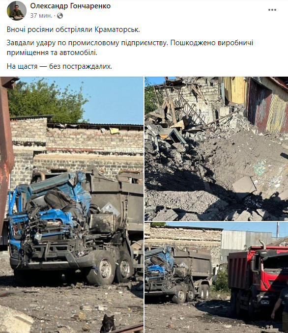 Ночью россияне обстреляли Краматорск. Нанесли удар по промышленному предприятию. Повреждены производственные помещения и автомобили.