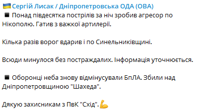 "Защитники неба снова отминусовали БПЛА. Сбили над Днепропетровщиной "Шахед", - сообщил Лысак.