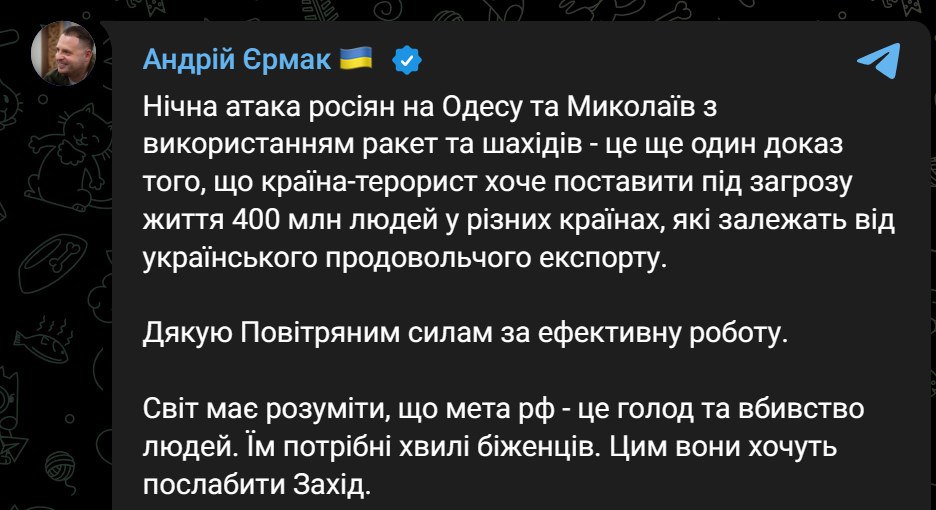 "Ночная атака россиян на Одессу и Николаев с использованием ракет и шахедов - еще одно доказательство того, что страна-террорист хочет поставить под угрозу жизнь 400 млн человек в разных странах, зависящих от украинского продовольственного экспорта", - написал Ермак, комментируя ночные удары.