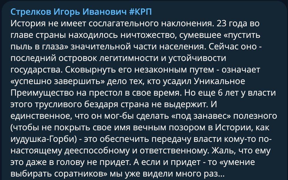 Пригожинская сетка телеграм-каналов, хоть и и пытается временами качать ситуацию, но в значительной степени притихла. Замолк и сам Пригожин. И на этом фоне Стрелков оставался самым известным и ярким критиком военно-политического руководства РФ. Тем более что, в отличие от большинства пригоженцев, он напрямую и очень жестко критикует лично Путина.