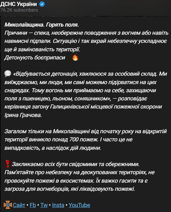 В Николаевской области из-за жары горят заминированные поля, происходит детонация.