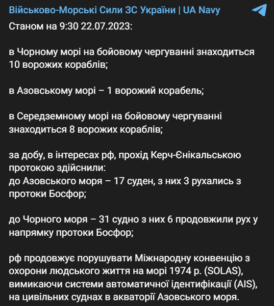 Также Россия угрожает топить все корабли, которые идут в украинские порты. Украина отреагировала на угрозы РФ зеркально, обещав ликвидировать корабли, направляющиеся в порты под контролем РФ.