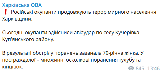16:00 Россияне совершили авиаудар по селу Кучеровка Купянского района. Об этом сообщает Харьковская ОВА.