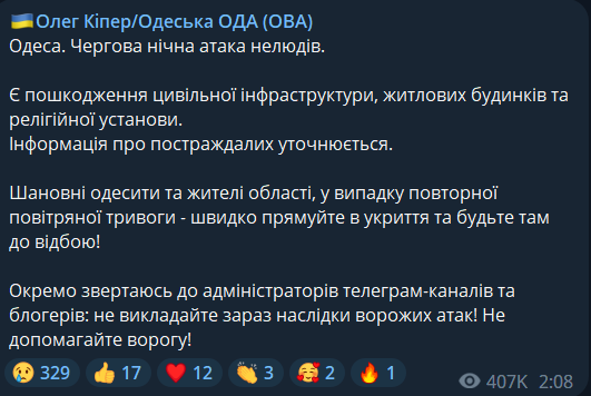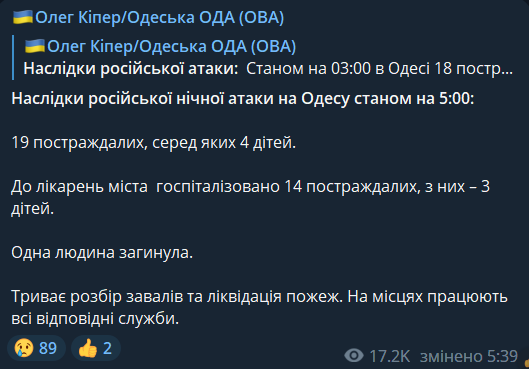 "Последствия российской ночной атаки на Одессу по состоянию на 5:00: 19 пострадавших, среди которых 4 детей. В больницы города госпитализированы 14 пострадавших, из них – 3 детей. Один человек погиб", - говорится в сообщении Кипера.