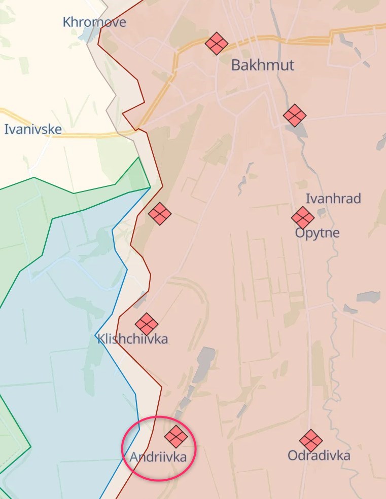 Предполагаемая цель этой атаки - перерезать сообщение Андреевки с Клещеевкой и блокировать ее с юга. За Клещеевку тоже идут ожесточенные бои - ранее сообщалось, что ВСУ закрепились на высотах западнее Клещеевки, также поступает информация, что Украина контролирует юго-западную часть поселка, за который продолжаются бои.