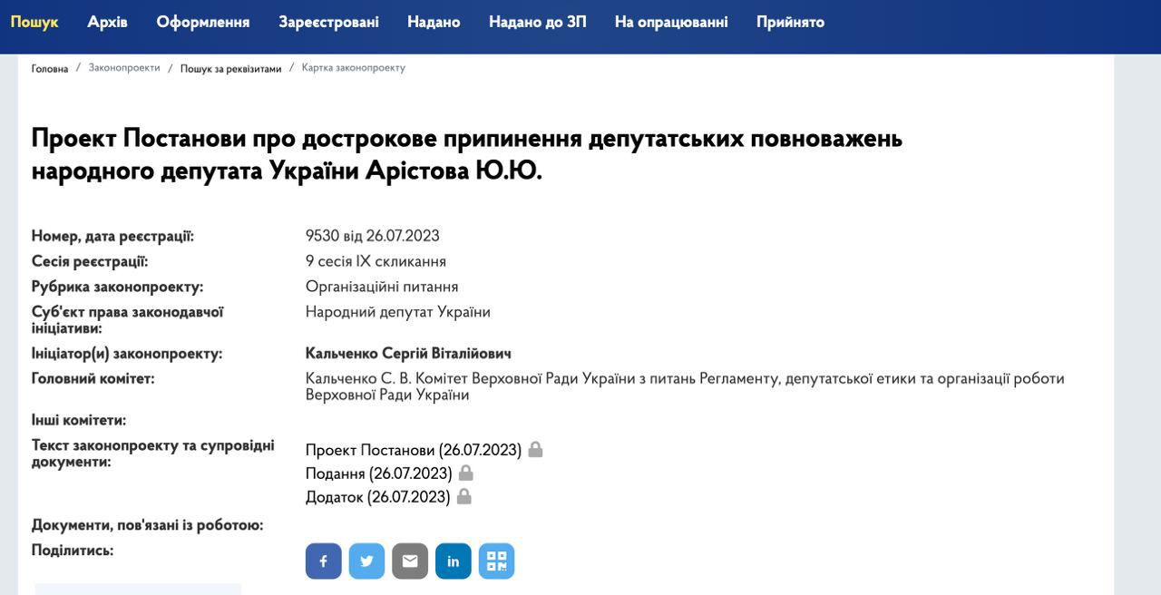 Постановление о лишении мандата нардепа Аристова зарегистрировали в Раде