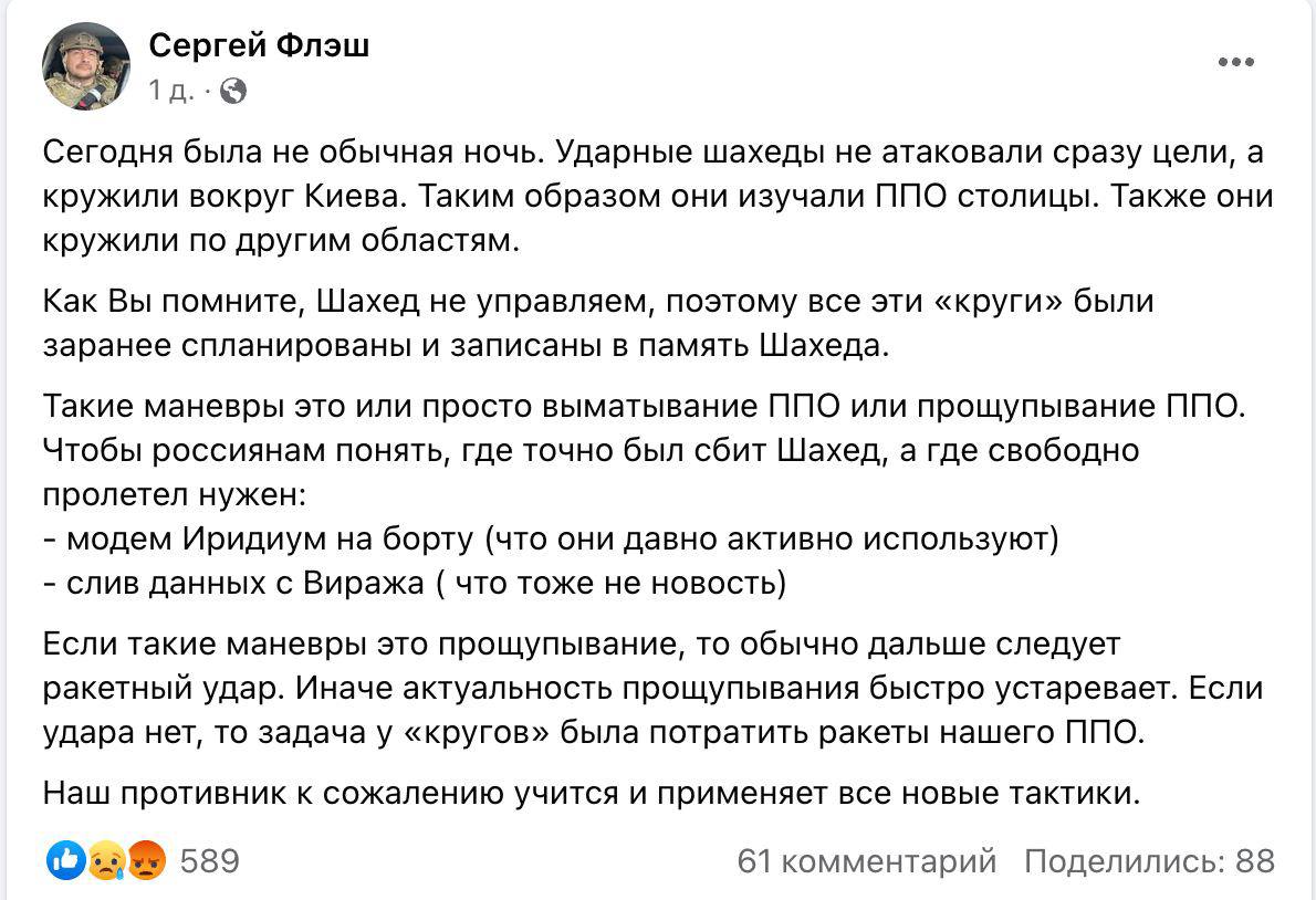 "Такие маневры - это или просто выматывание ПВО, или прощупывание ПВО. Чтобы россиянам понять, где точно был сбит "Шахед", а где свободно пролетел. Если такие маневры - это прощупывание, то обычно дальше следует ракетный удар. Иначе актуальность прощупывания быстро устаревает. Если удара нет, то задача у кругов была потратить ракеты нашего ПВО", - пишет Бескрестнов.