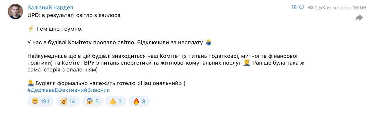 "И смешно и грустно. Самое забавное, что в этом здании находится наш комитет (по вопросам налоговой, таможенной и финансовой политики) и комитет ВРУ по вопросам энергетики и жилищно-коммунальных услуг. Раньше была такая же история с отоплением", - написал нардеп.
