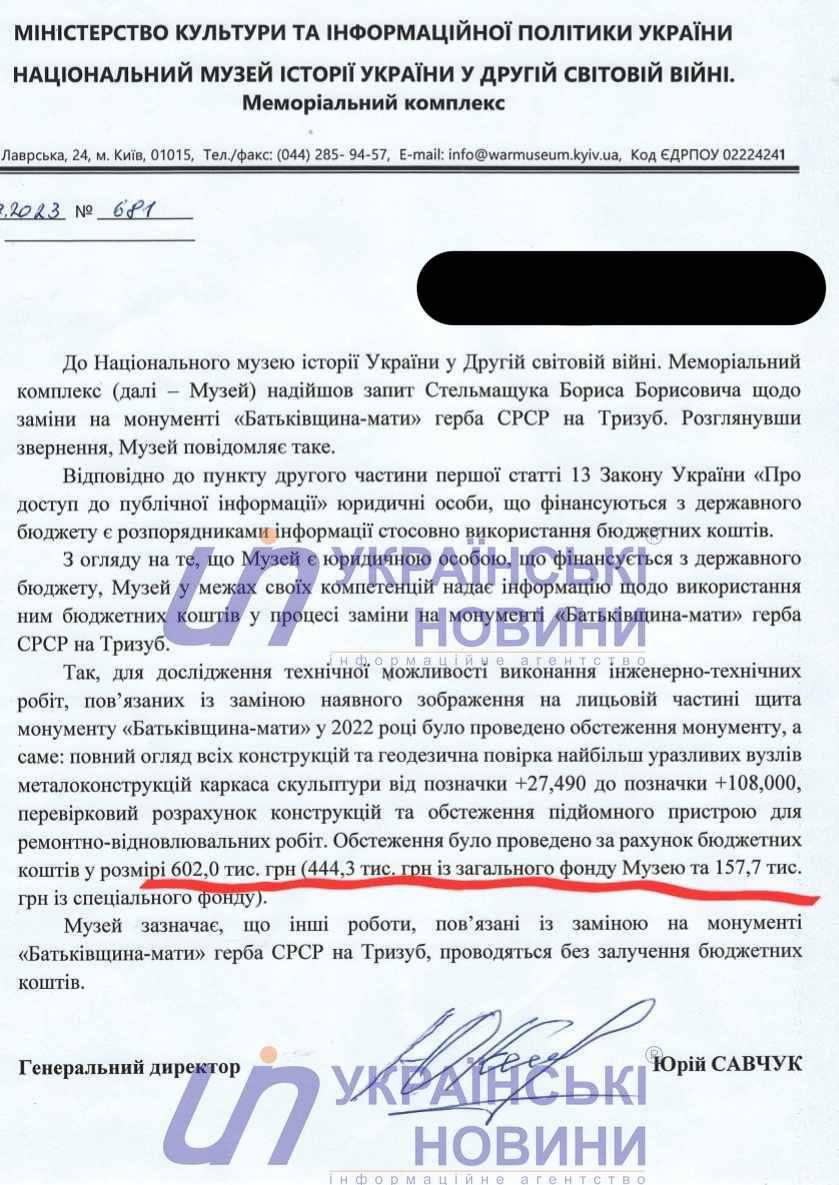 Замена советского герба на трезубец на щите монумента Родины-матери все же частично финансируется из госбюджета. Хотя Минкульт заверял, что на это будут потрачены исключительно деньги меценатов и доноров.