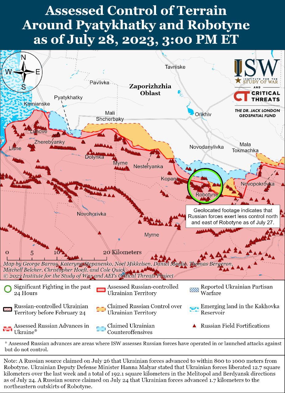 "На кадрах с геолокацией, опубликованных 28 июля, видно, как российские подразделения 21-го мотострелкового полка (2-я общевойсковая армия, Центральный военный округ) переправляются через реку Жеребец юго-западнее н. п. Кармазиновка", - говорится в отчете ISW.