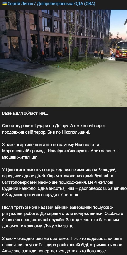 Из-за вчерашнего ракетного удара по Днепру пострадали девять человек. Среди них двое детей – 14 и 17 лет. Погибших нет.