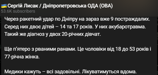 Из-за вчерашнего ракетного удара по Днепру пострадали девять человек. Среди них двое детей – 14 и 17 лет, у них акубаротравма. Такой же диагноз у двух 20-летних девушек. Еще пятеро с рваными ранами. Это мужчины от 18 до 53 лет и 77-летняя женщина.
