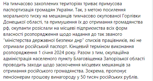 Также оккупационная администрация Благовещенки Запорожской области нашла способ поощрения местных жителей к получению российского гражданства. Там предлагают пенсионерам денежную выплату в 50 тысяч российских рублей (почти 20 тысяч гривен - Ред.).