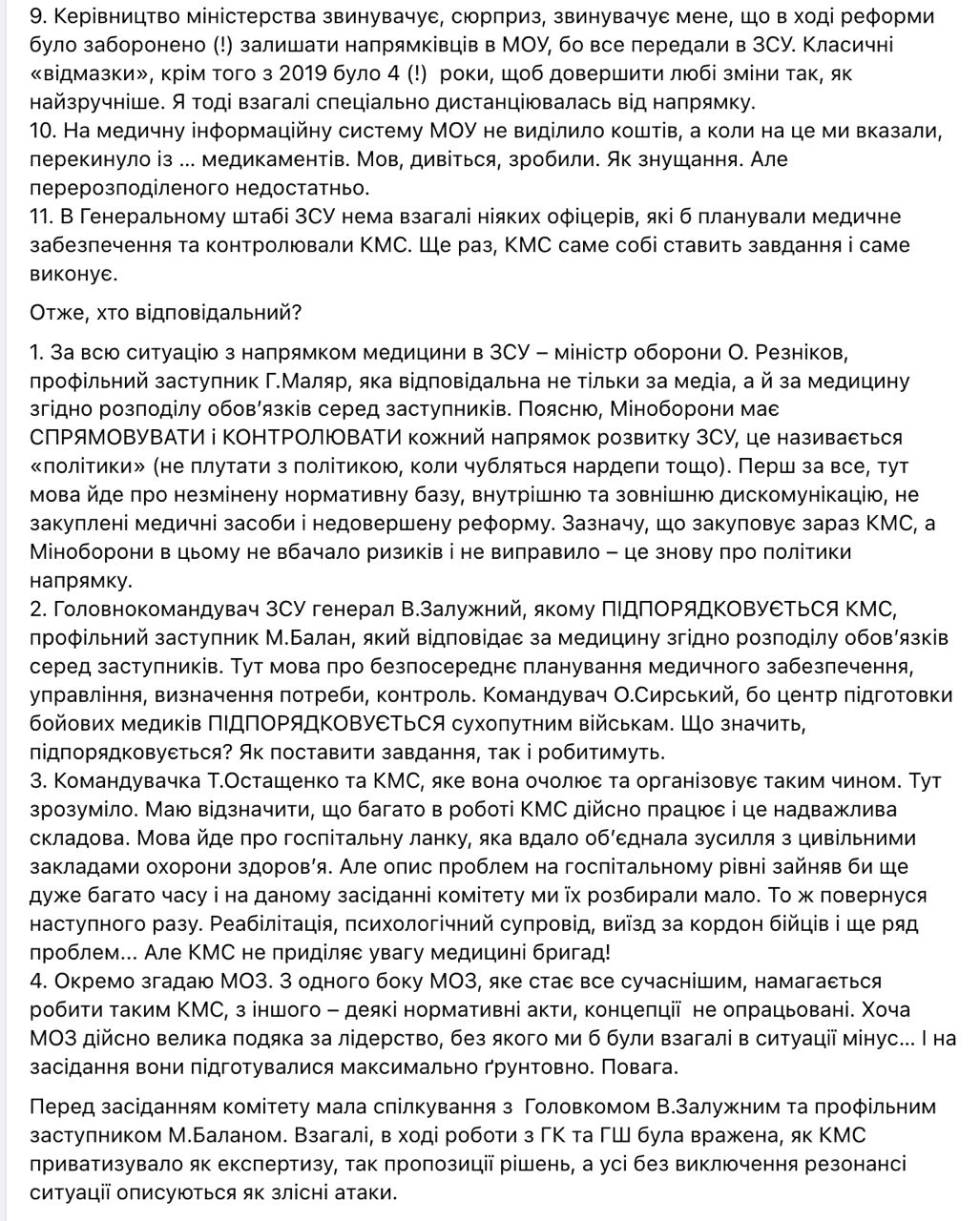 Она называет ответственными за ситуацию министра обороны Резникова, его заместителя Маляр, главнокомандующего Залужного, его заместителя Балана, командующего Сухопутными войсками Сырского, командующего Медицинскими силами Татьяну Остащенко.