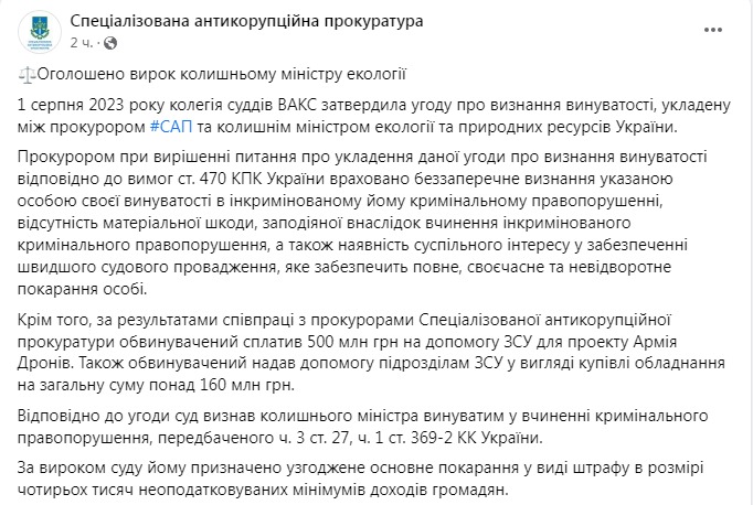 Сегодня коллегия судей ВАКС утвердила соглашение о признании виновности, заключенное между прокурором САП и бывшим министром экологии и природных ресурсов Украины Николаем Злочевским. Суд назначил ему наказание в виде штрафа в размере 68 тысяч гривен за злоупотребление влиянием.