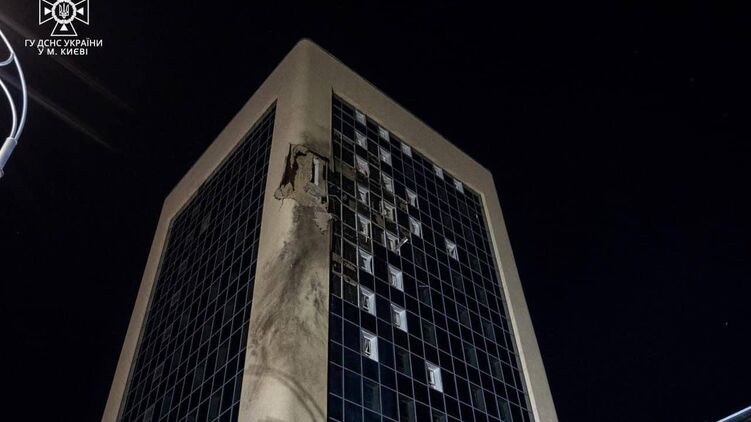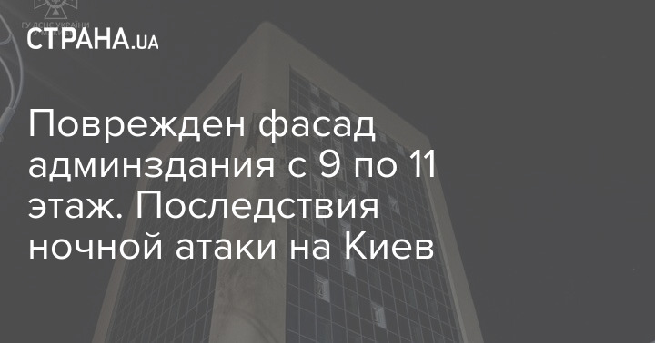 Во время сегодняшней атаки на Киев из-за падения обломков "Шахеда" поврежден фасад админздания, пострадали окна с 9 по 11 этаж.