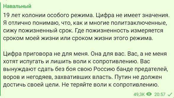 "19 лет колонии особого режима. Цифра не имеет значения. Я отлично понимаю, что, как и многие политзаключенные, сижу пожизненный срок. Где пожизненность измеряется сроком моей жизни или сроком жизни этого режима. Цифра приговора не для меня. Она для вас. Вас, а не меня хотят испугать и лишить воли к сопротивлению. Вас вынуждают сдать без боя свою Россию банде предателей, воров и негодяев, захвативших власть. Путин не должен достичь своей цели. Не теряйте воли к сопротивлению", – написал Навальный.