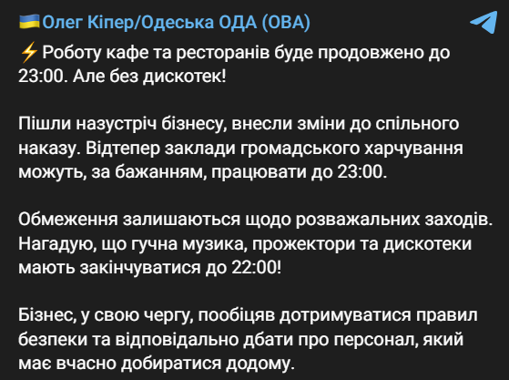 "Пошли навстречу бизнесу, внесли изменения в общий приказ. Теперь заведения общепита могут, по желанию, работать до 23:00", - написал Кипер.