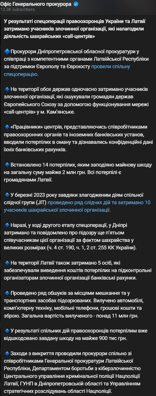 Спецоперация проводилась совместно правоохранителями Украины и Латвии при поддержке Европола и Евроюста.