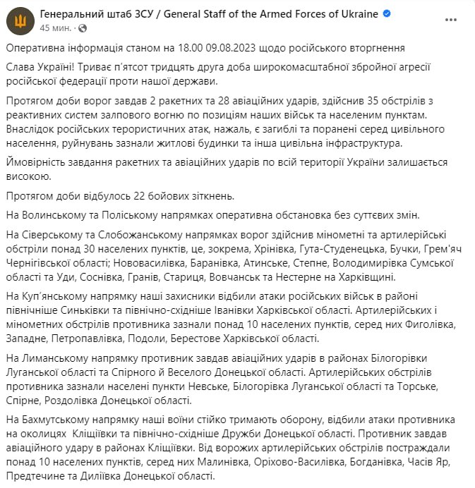 В среду, 9 августа, Генштаб Вооруженных сил Украины опубликовал свежую вечернюю сводку.