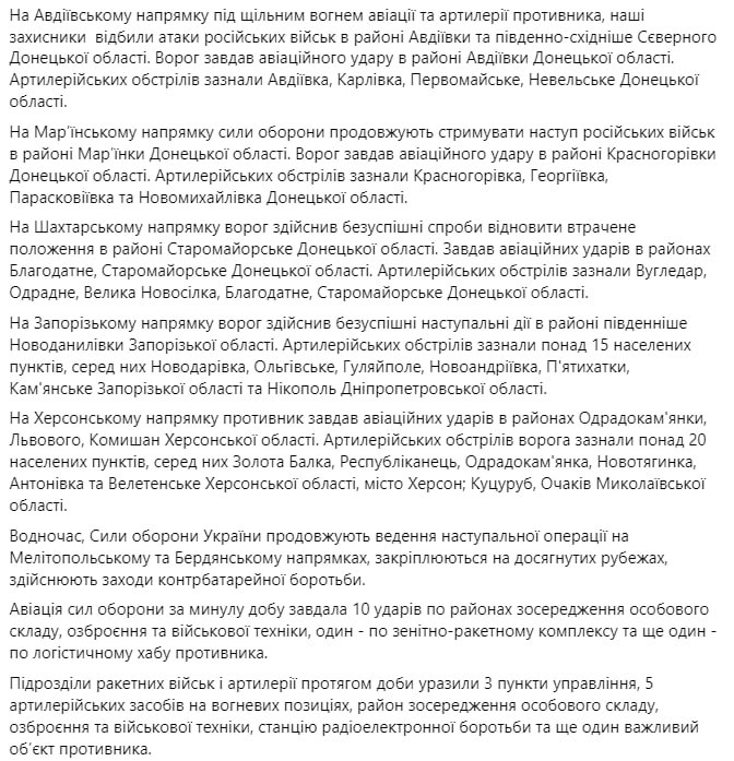 - Произошло 22 боестолкновений. Отражены российские атаки на направлениях: Купянском – в районе севернее Синьковки и северо-восточнее Ивановки, Лиманском – в районах Белогоровки Луганской области, Спорного и Веселого Донецкой области, Бахмутском – в окрестностях Клещеевки и северо-восточнее Дружбы, Авдеевском – в районе Авдеевки и юго-восточнее Северного, Марьинском – в районе Марьинки, Шахтерском – в районе Старомайорского, Запорожском – южнее Новоданиловки.
