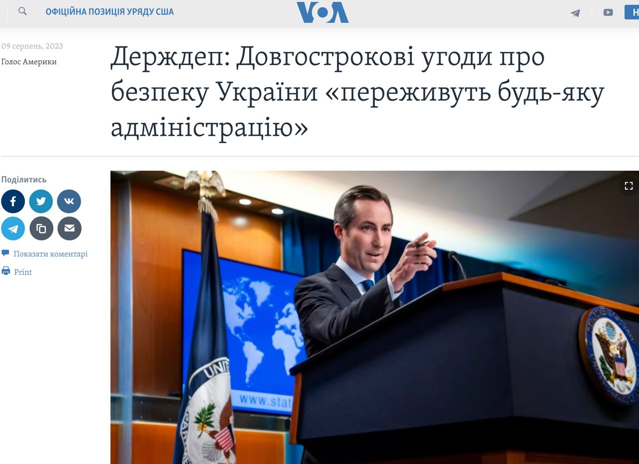 "Мы должны закрепить долгосрочные соглашения о безопасности, которые переживут любую администрацию, любое правительство как здесь, в Соединенных Штатах, так и среди наших союзников и партнеров, взявших на себя долгосрочные обязательства по безопасности Украины", – заявил спикер Госдепа Мэтью Миллер, передает "Голос Америки".