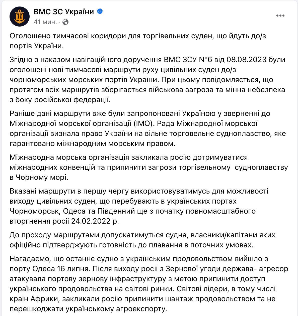 Указанные маршруты будут в первую очередь использоваться для возможности выхода гражданских судов, которые стоят в портах Черноморск, Одесса и Южный еще с начала вторжения.