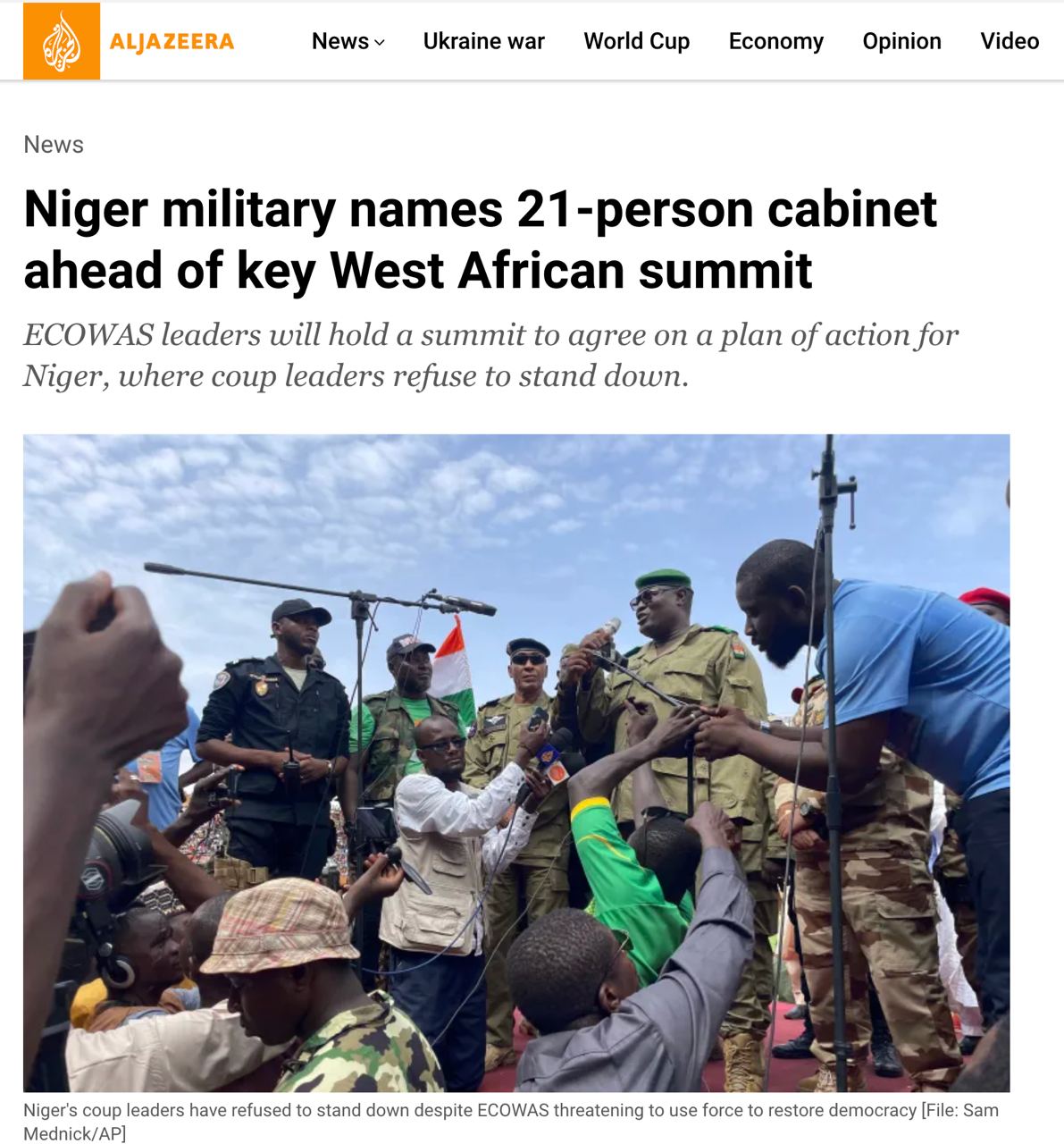 Тем временем мятежники в Нигере объявили состав своего будущего "правительства", в который войдет 21 человек. Это вдвое меньше чем было в официальном правительстве, которое свергли.