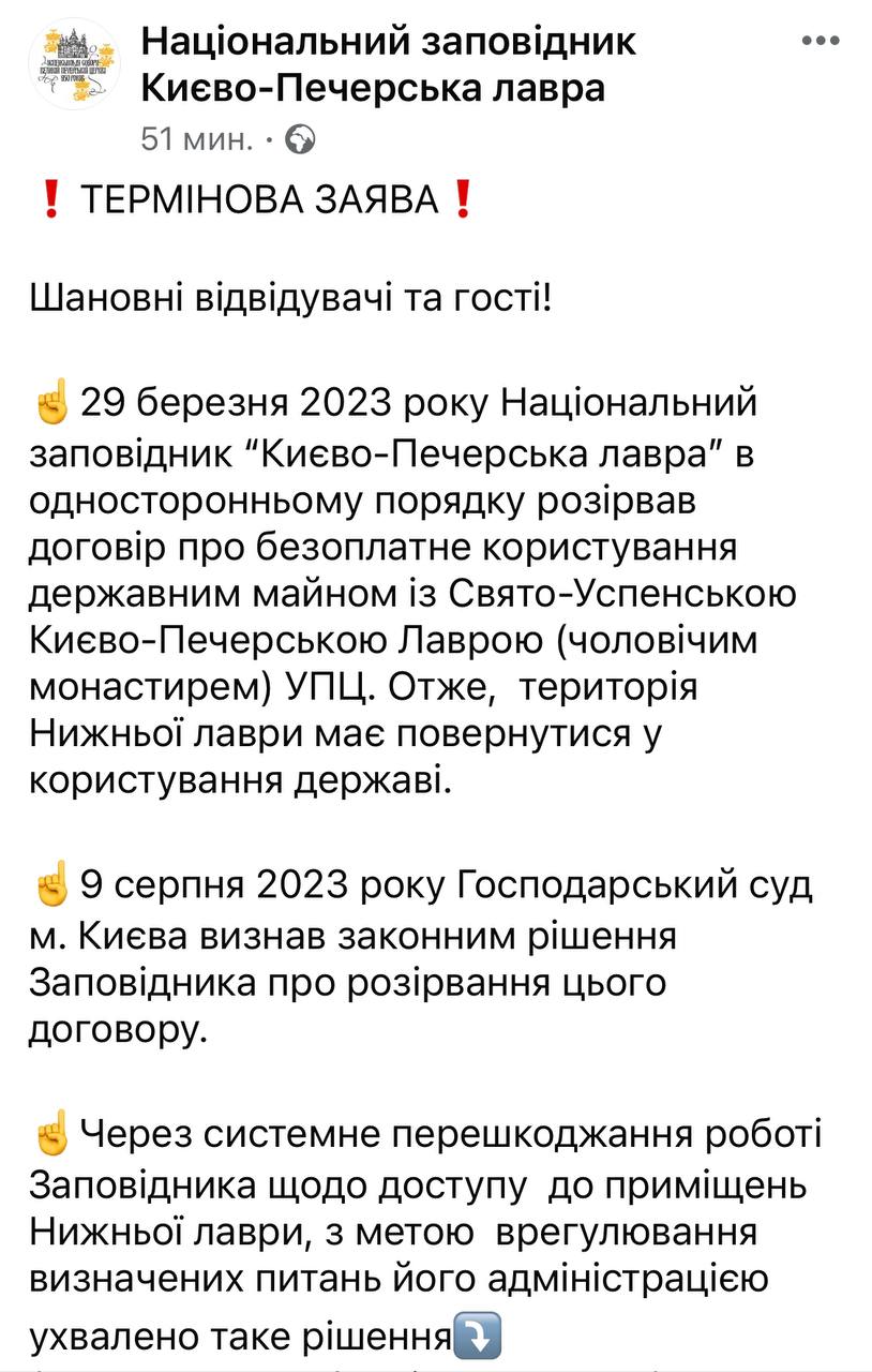 В заявлении заповедника говорится: "из-за препятствования работе Заповедника по доступу к помещениям Нижней лавры с целью урегулирования определенных вопросов его администрацией принято решение:
