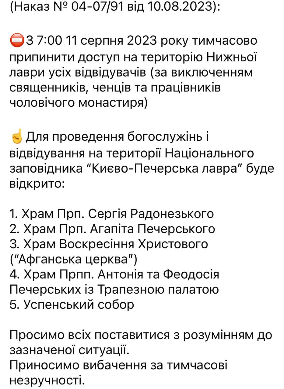 С 7:00, 11 августа 2023 г. временно прекратить доступ на территорию Нижней лавры всех посетителей за исключением священников, монахов и работников мужского монастыря".