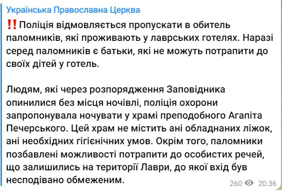 "Людям, которые по распоряжению Заповедника оказались без места ночлега, полиция охраны предложила ночевать в храме преподобного Агапита Печерского. Этот храм не содержит ни оборудованных кроватей, ни необходимых гигиенических условий. Кроме того, паломники лишены возможности попасть к личным вещам, оставшиеся на территории Лавры, в которую вход был неожиданно ограничен", – говорится в сообщении.