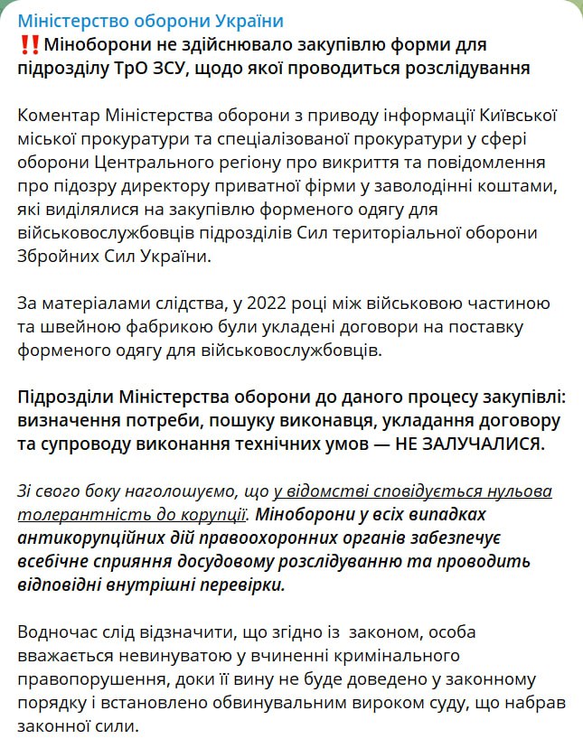 В Минобороны отрицают причастность к закупкам некачественной формы. Фото: t.me/ministry_of_defense_ua