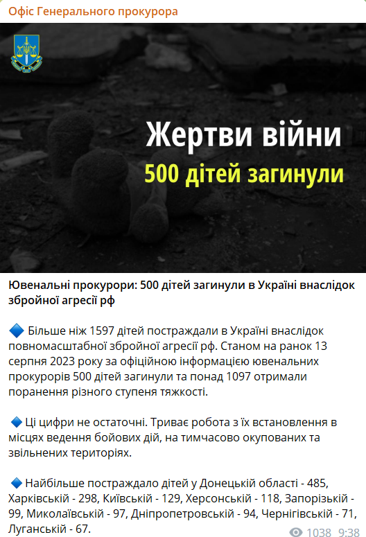 В Украине в результате вооруженной агрессии РФ погибли 500 детей и более 1097 получили ранения различной степени тяжести, больше всего пострадавших детей в Донецкой области - 485 человек.