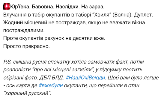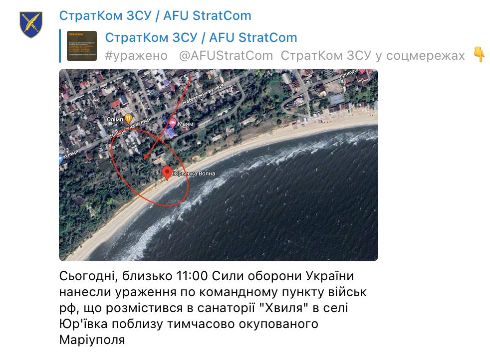 Вскоре в ВСУ подтвердили удар по Юрьевке. Стратком заявил, что был поражен командный пункт войск РФ в санатории "Волна".