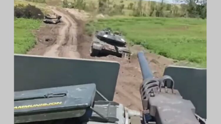 На видео можно заметить, что военнослужащие ВСУ едут на борту бронированной техники по грунтовой дороге, на обочинах которой находится два танка Leopard. На одном из них видны сильные следы копоти.