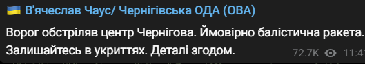 11:50 Глава Черниговской ОВА Чаус заявил, что россияне ударили по центру Чернигова балистичными ракетами.