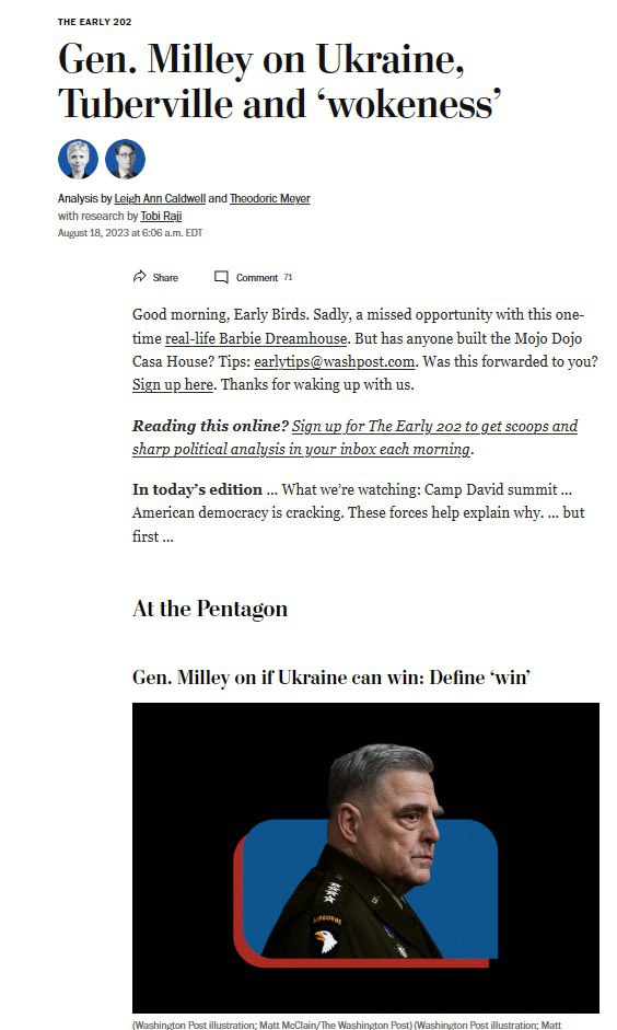 Ранее газета Politico привела мнение американских чиновников, которые заявили, что Милли был прав, предлагая провести переговоры с Россией зимой 2023 года
