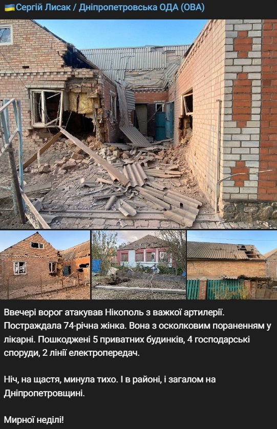 09:00 Вчера вечером россияне атаковали Никополь Днепропетровской области из тяжелой артиллерии. В результате обстрела есть пострадавшая женщина.