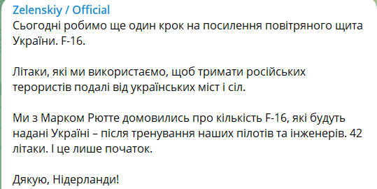 "Мы с Марком Рютте договорились о количестве F-16, которые будут предоставлены Украине после тренировки наших пилотов и инженеров. 42 самолета", - заявил Зеленский.