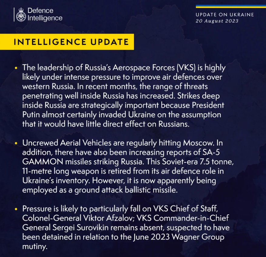 В британской разведке отмечают, что вероятно руководство Воздушно-космических сил России (ВКС) находится под сильным давлением с целью улучшения противовоздушной обороны над западной частью РФ.