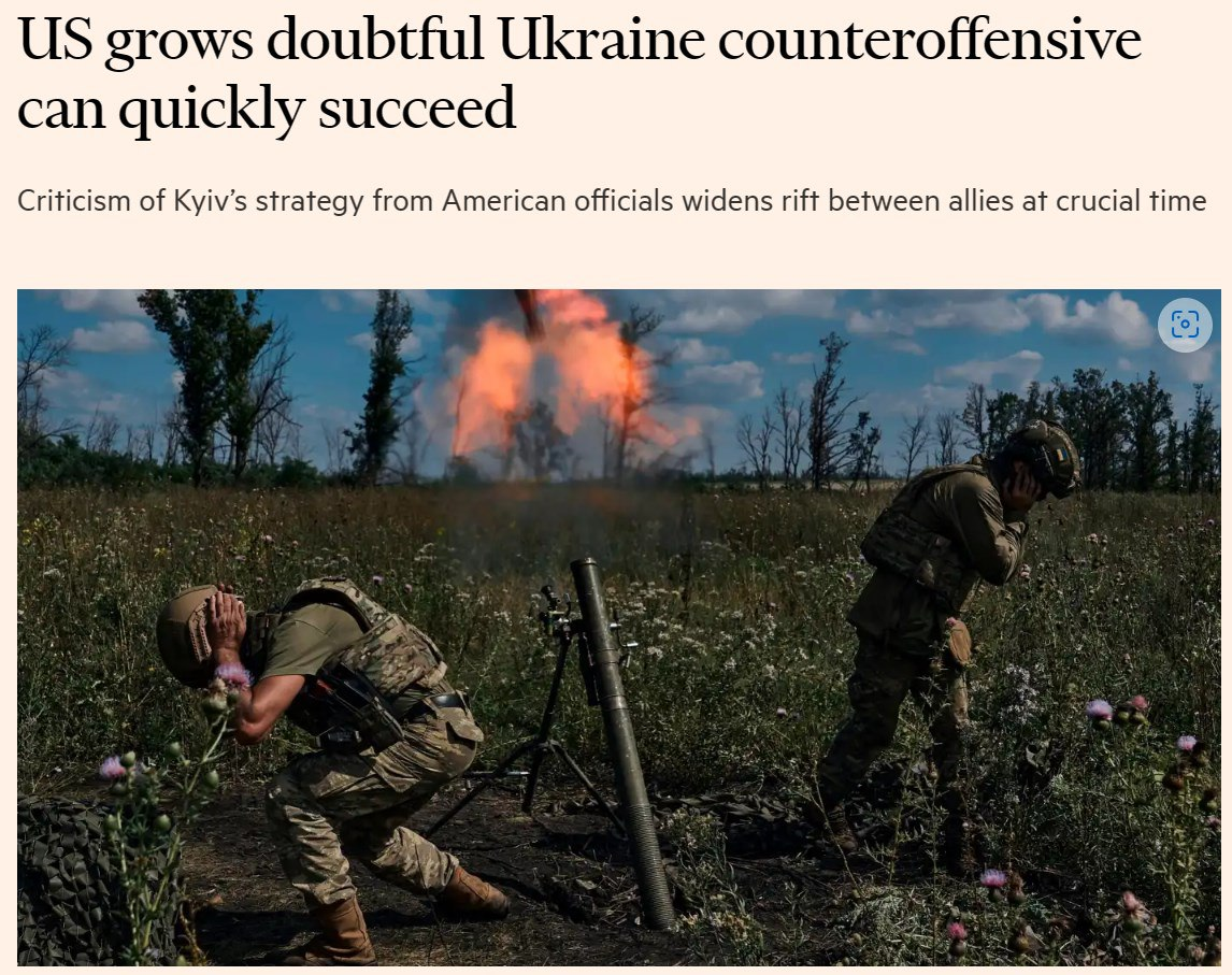 "Официальные лица США все более критически относятся к стратегии контрнаступления Украины и мрачно относятся к ее перспективам на успех, что усугубляет напряженность между Киевом и Вашингтоном в самый критический момент войны", - пишет издание.