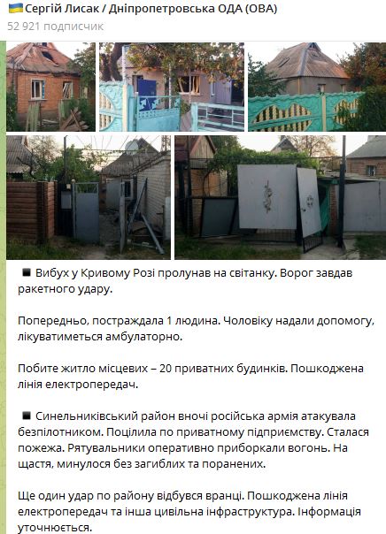 Также ночью и утром РФ атаковала Синельниковский район. Повреждено частное предприятие, там был пожар. Повреждена линия электропередач.