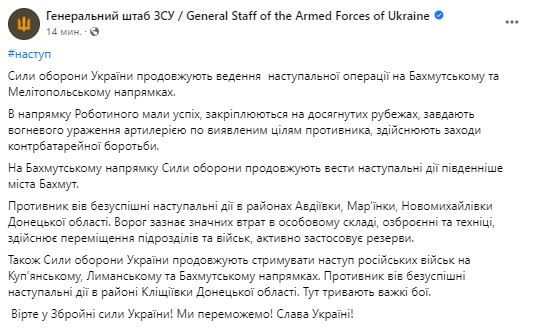 Силы обороны Украины продолжают вести наступательную операцию на Бахмутском и Мелитопольском направлениях.